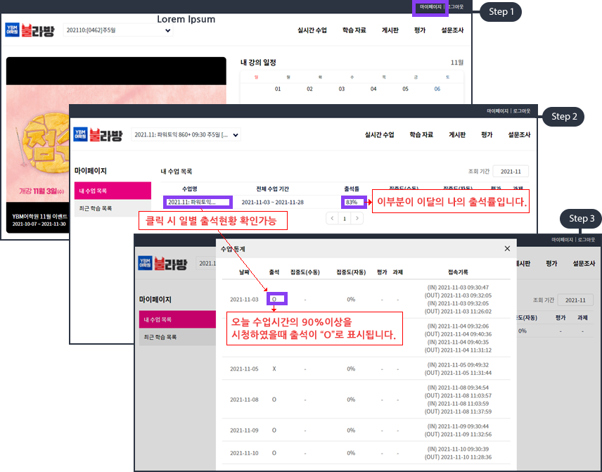 ① 출석률 확인 방법: YBM어학원 홈페이지>불라방보기>라이브클래스 마이페이지>내수업목록>수업명 클릭