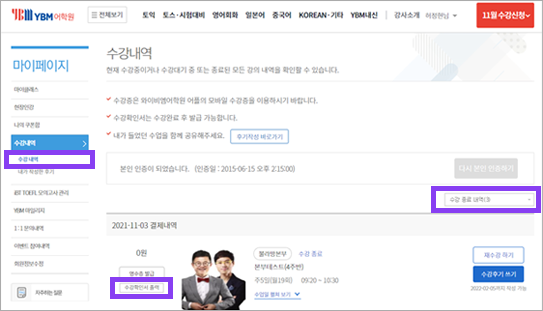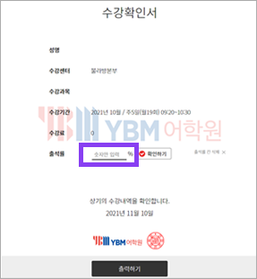 YBM어학원 홈페이지 > 마이페이지 > 수강내역 > 수강종료내역 >해당과목 수강확인서 출력 > 수강확인서에 출석률 직접 입력
