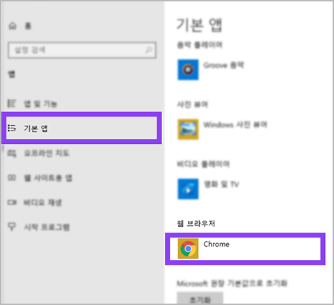 윈도우>설정>앱>기본앱>웹브라우저>크롬 선택