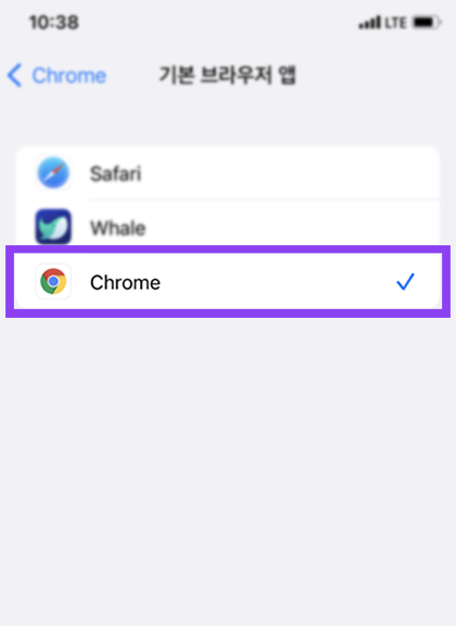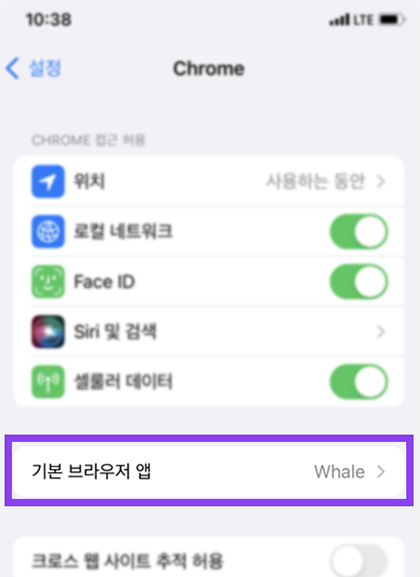 iOS: 설정>크롬>브라우저앱>크롬 선택